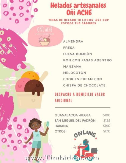 Se venden deliciosos helados artesanales, en tinas de 10 Litros, contando con servicios de mensajería hasta su hogar, por un costo adicional, de diferentes sabores y precios, elaborados con frutas naturales y hechos en la prestigiosa Heladería Artesanal "Oñí Ashé" y su maravilloso equipo de profesionales, altamente capacitados, para hacer de su pedido una experiencia única y excepcional, para su gusto y su paladar.
