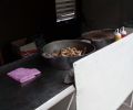 Planchas de aluminio, bandejas de acero inoxidable, ventanas de cristal y de acordeón, puerta metálica, pila de lavado, carrito para barbacoa de carbón.