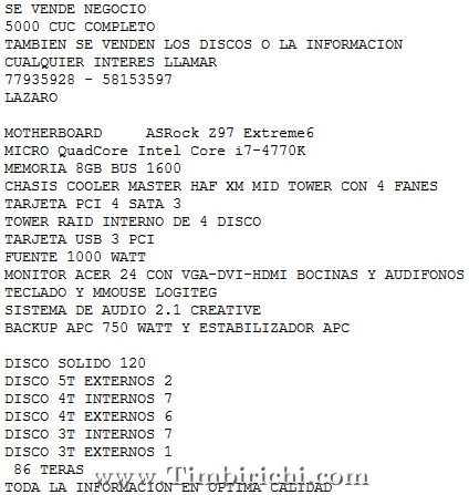 SE VENDE NEGOCIO COMPLETO EN 5000 CUC. SON 86 TERAS DE INFORMACIÓN.